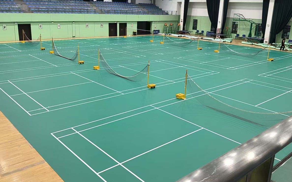 This multi-purpose sports hall was originally a basketball court and has now been renovated into a badminton court. A total of 8 courts are required. Additionally, the buffer zones outside the courts also utilize PVC sports flooring to protect the basketball court surface.