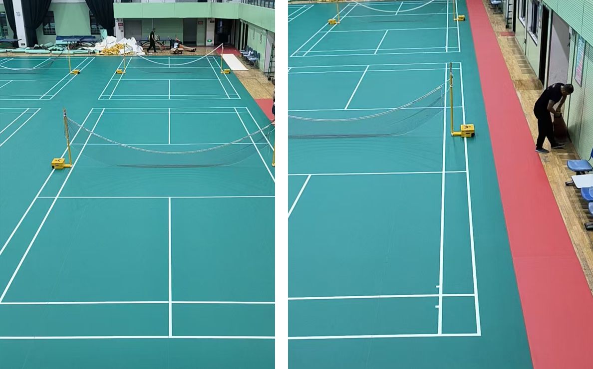 The original subfloor was solid wood basketball flooring. Therefore, the installation team opted to secure the badminton flooring with double-sided tape, allowing for easy removal and storage.