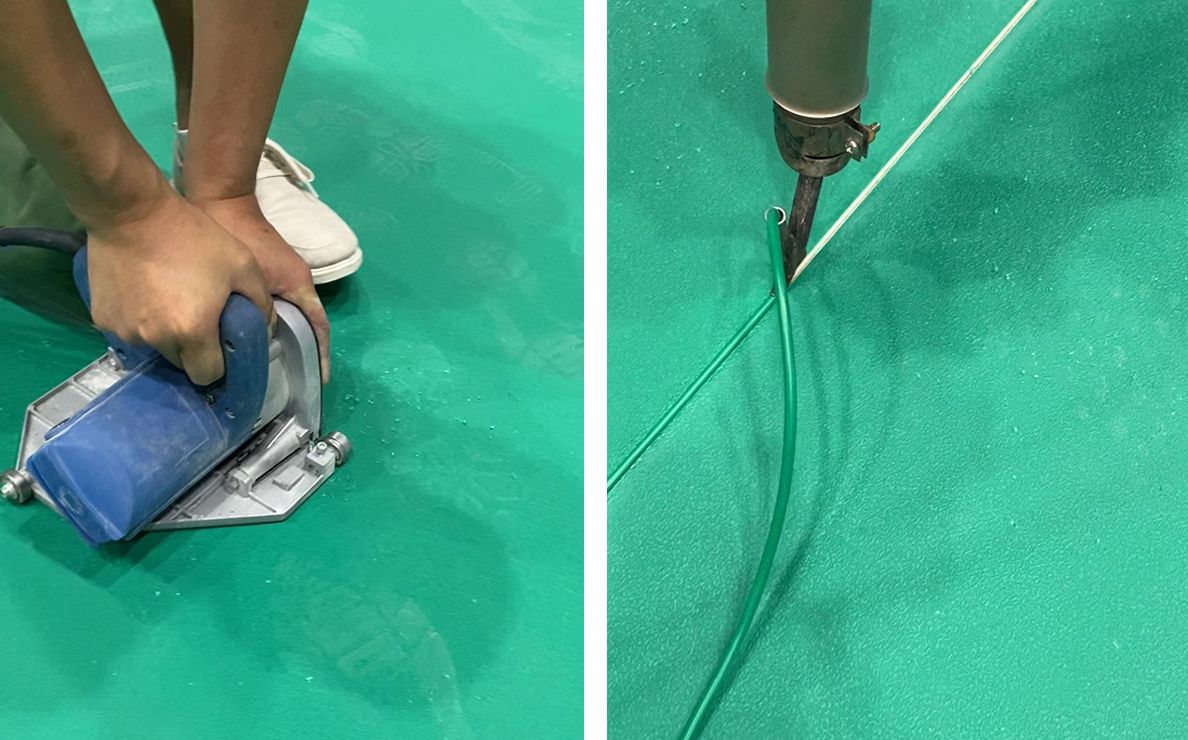 2: Install using tools such as a welding torch, welding rods, and utility knives. Achieve seamless connections between floor panels to enhance longevity. Install the badminton court area first, by the outer buffer zone.